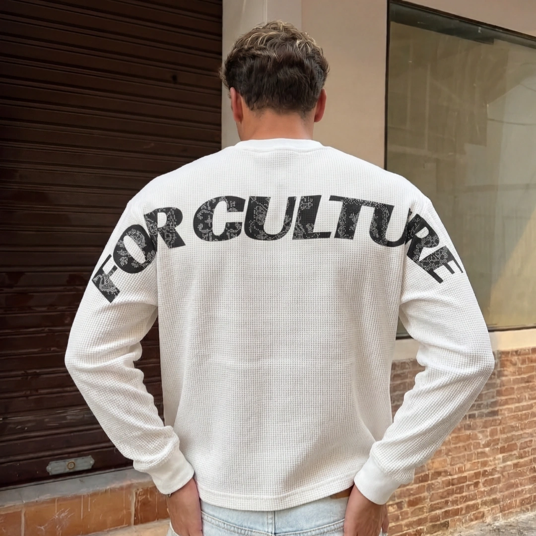 The FOR CULTURE Waffle Long Sleeve is crafted from lightweight cotton waffle fabric, delivering breathable comfort with a soft textured feel. Designed with a crop and boxy silhouette, it creates a clean, structured fit that sits naturally within modern streetwear.